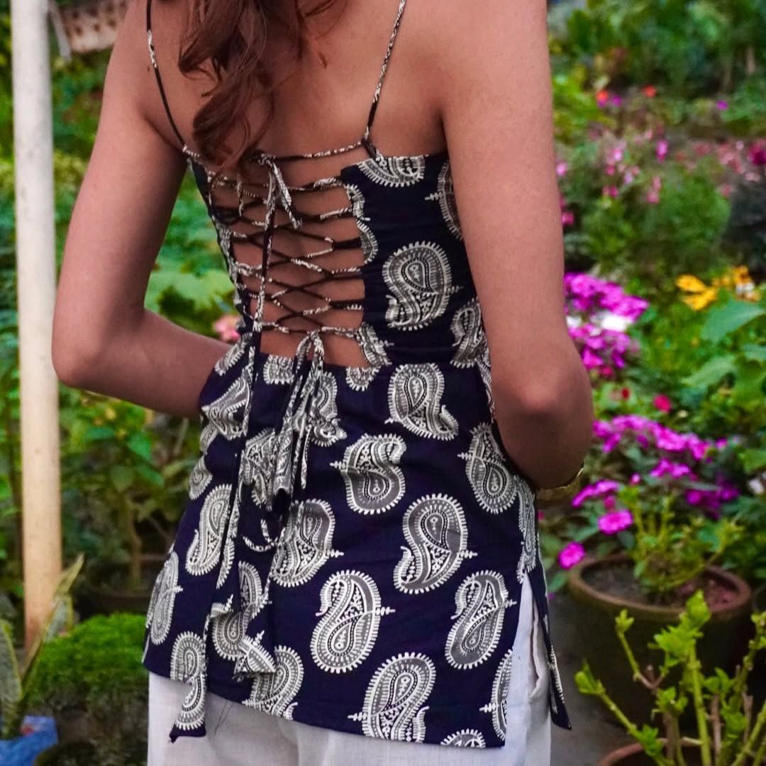 The Anshi t-shirt Kurti, which has an eye-catching open-back design with elaborate lace-up detailing, is a celebration of freedom and craftsmanship. This piece, which is made of deep navy soft, breathable cotton and features traditional white paisley handblock print, gives a touch of tradition to an otherwise rebellious silhouette.