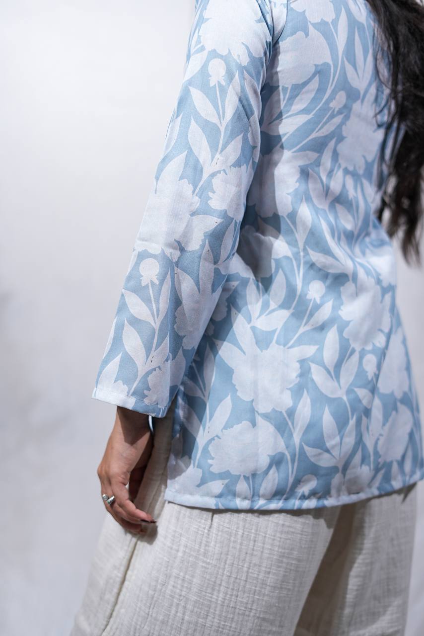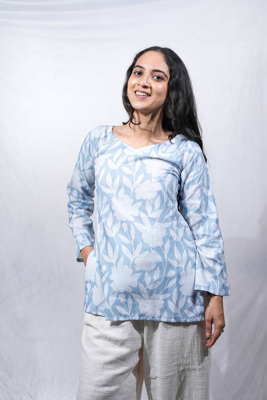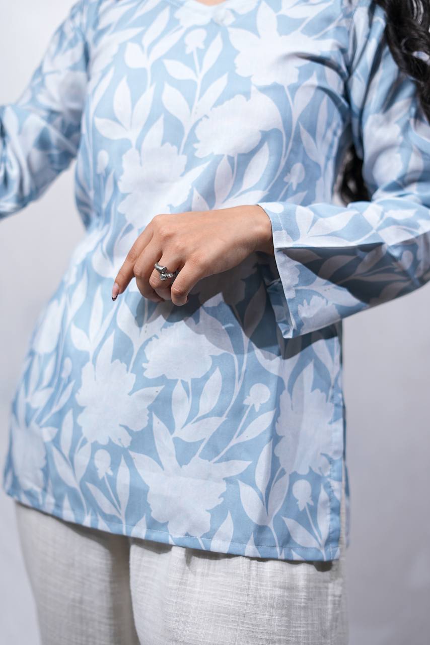 Meet Juliee floral full sleeved kurti is crafted from machine‑woven pure cotton, offering a soft and breathable feel ideal for everyday wear in warm climates. Adorned with a serene white floral hand block print against a pastel-blue backdrop, its pattern evokes handcrafted floral elegance reminiscent block-printed Jaipur style. Designed with a V-neckline and long regular sleeves, it maintains a clean, straight silhouette that flatters effortlessly and moves gracefully.