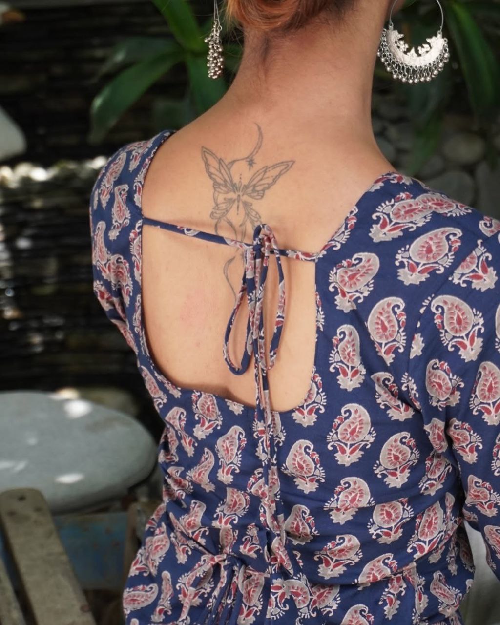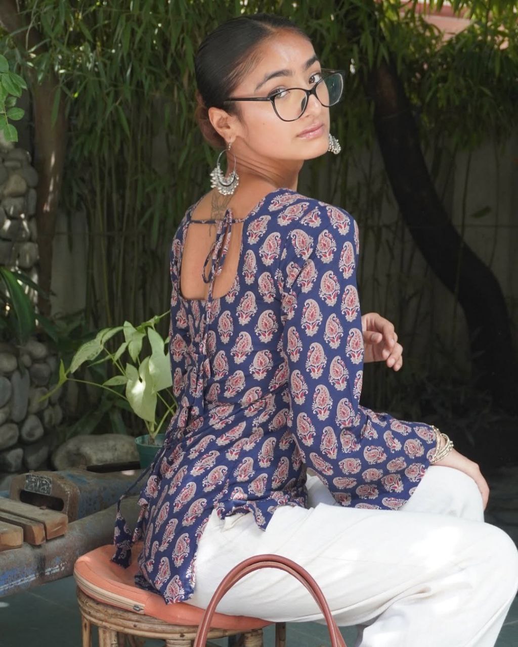 Khushi deep back sleeved kurti with a traditional paisley motif in earthy tones is hand-block printed as part of the ensemble. The Khushi kurti, which is made of soft, breathable cotton, is perfect for daily wear because it has a straight hem that falls just below the hips, full sleeves, and a flattering scoop neckline.