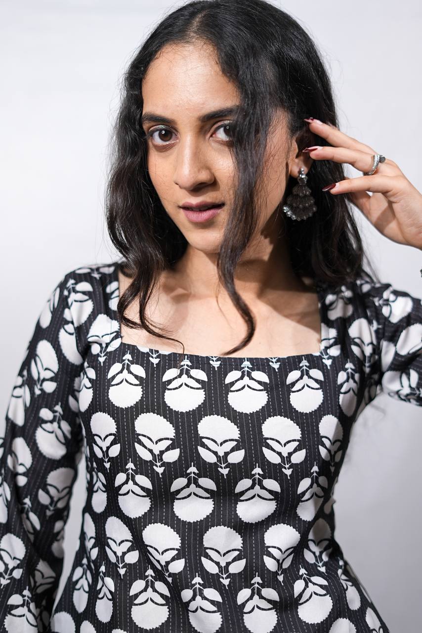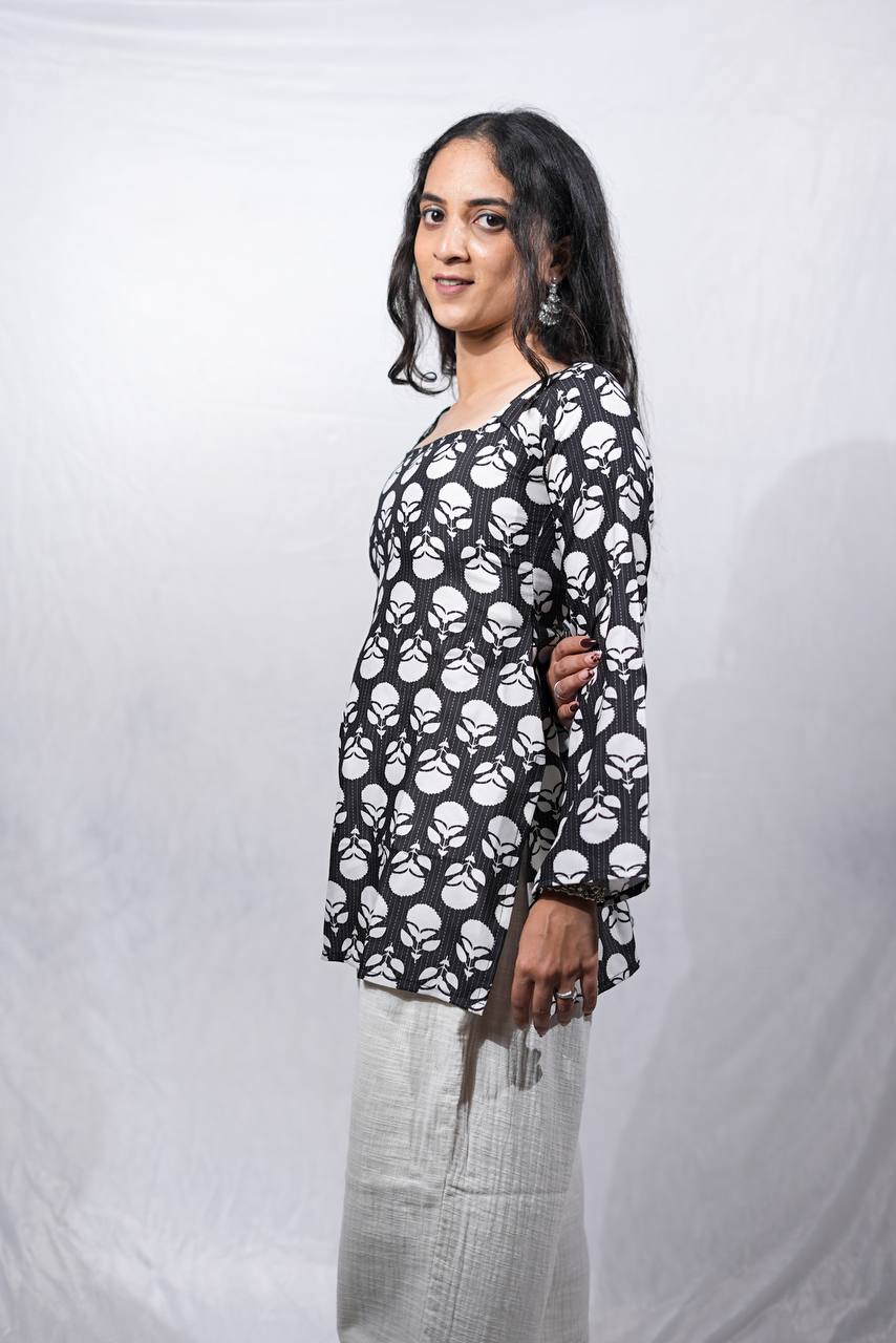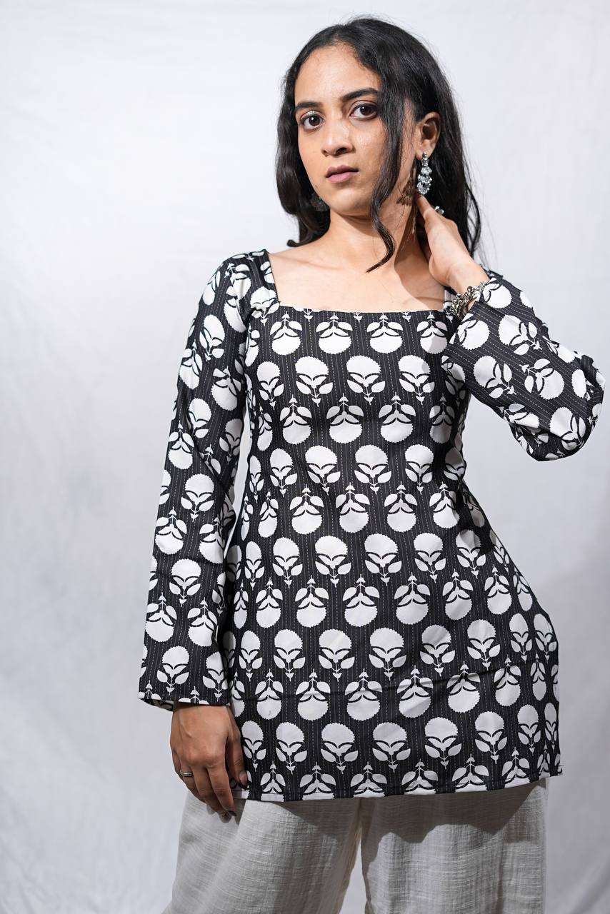 The Meher full sleeve kurti, a monochrome masterpiece that commands attention. Designed with a structured square neckline and full sleeves, this kurti brings a contemporary twist to traditional block printing.